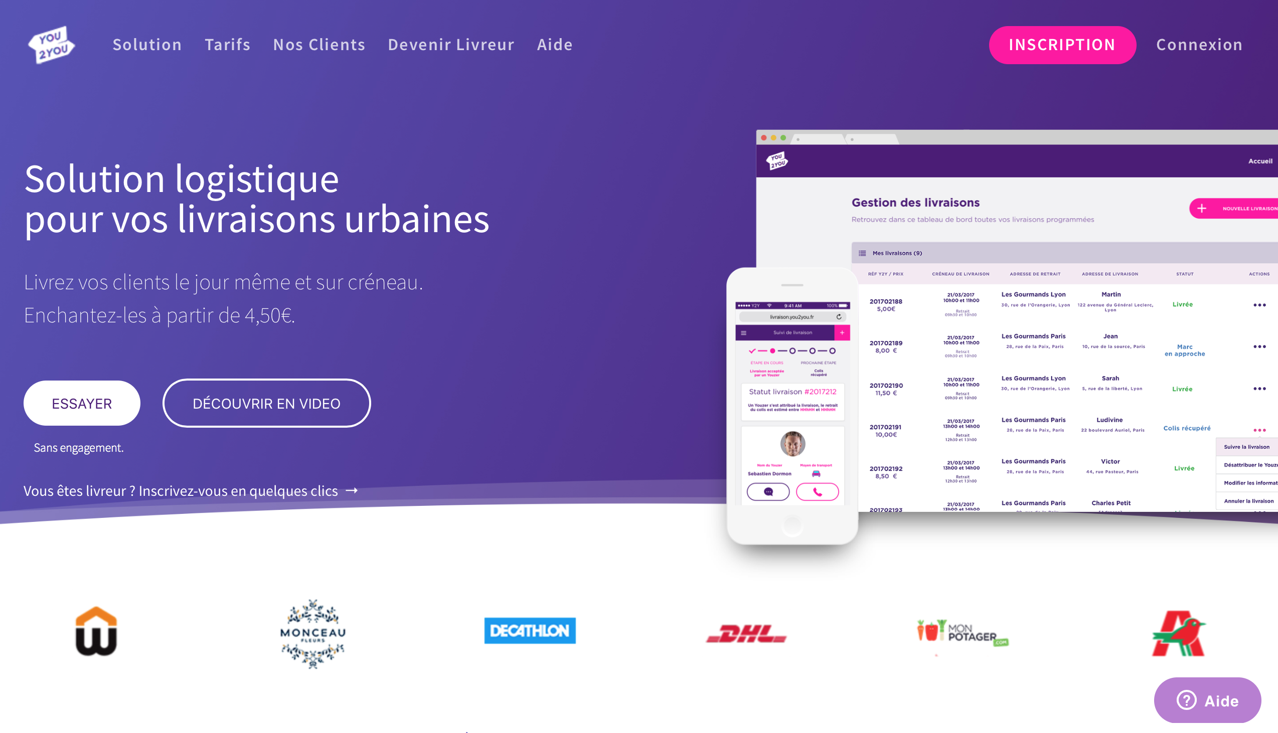 You2you est une plateforme de livraison pour startups et commerçants. Objectif affiché de livrer moins cher, plus vite grâce à sa communauté collaborative. Sans engagement. Expédition de colis en 1h30 à partir de 4,50€